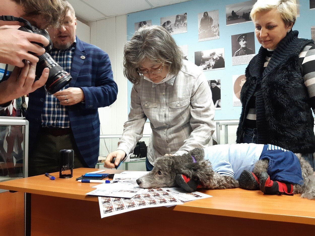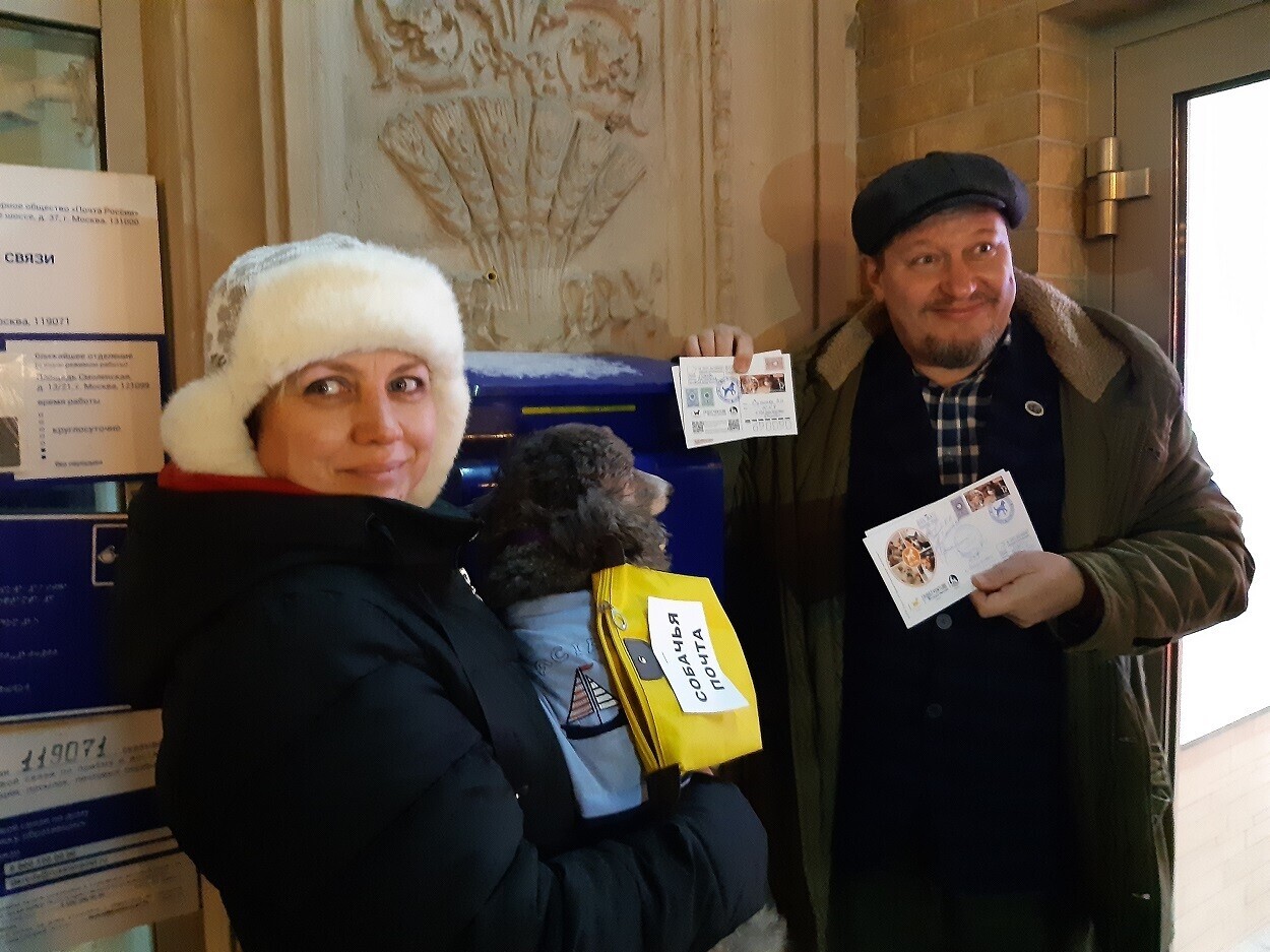 Съобщава се също, че за откриването на кучешката поща е отпечатана специфична марка, като е пуснат и лимитиран тираж пликове, пощенски картички и колекционерски марки. Една от тях е дървена 3D марка с винетка с номинална стойност „5 кокълчета“, а към нея е прибавен и документ. Всичко това можете да видите на изложбата в Музея на кучетата на Малая Калужская улица №12.