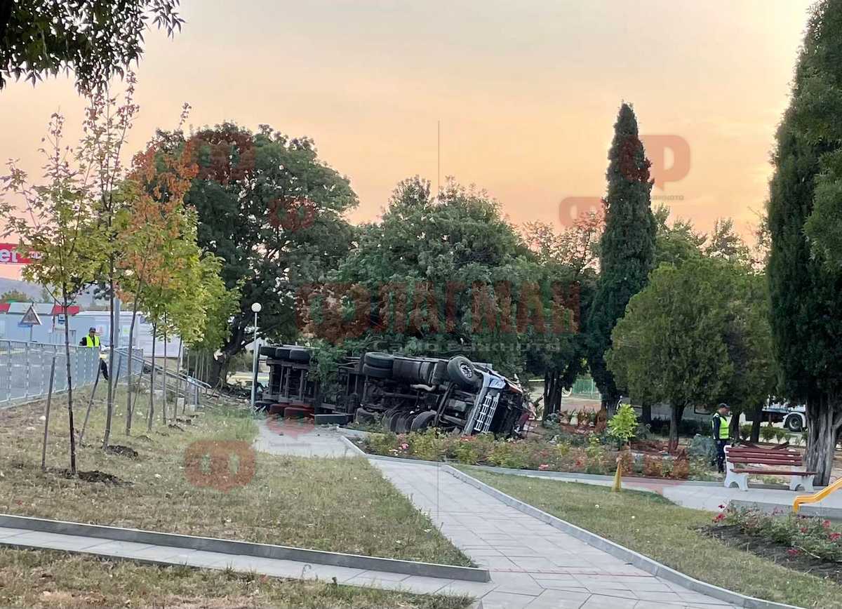 Тирът е блъснал две коли, след което се преобърнал в градинката пред Горското стопанство в града. Наложи се екипи на пожарната да срежат камиона, с цел да извадят водача, който е оживял при случая.