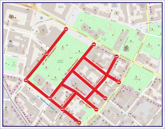От 06.30 часа до привършване на събитията на 11.01.2018 година: на площад „ Кн. Александър І ”, против Национална художествена галерия; на пл. „ Кн. Александър І ” сред бул. „ Цар Освободител ” и ул. „ Московска ”.