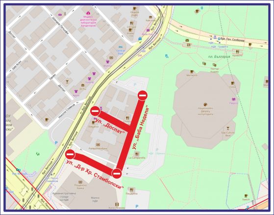 От 17.30 часа на 10-и до привършване на мероприятията на 11 януари: на ул. „ Кн. Александър І ” сред ул. „ Ген. Гурко ” и бул. „ Цар Освободител ”; на ул. „ Аксаков ” сред ул. „ Дякон Игнатий ” и ул. „ Г.С.Раковски ”; на ул. „ Дякон Игнатий ” сред ул. „ Ген. Гурко ” и бул. „ Цар Освободител ”; на ул. „ Кузман Шапкарев ” сред ул. „ Иван Вазов ” и ул. „ Ген. Гурко ”; на ул. „ Славянска ” сред ул. „ Г.С.Раковски ” и ул. „ Дякон Игнатий ”; на ул. „ Г.Бенковски ” сред бул. „ Цар Освободител ” и ул. „ Иван Вазов ”; на ул. „ Иван Вазов ” сред ул. „ Г.С.Раковски ” и ул. „ Дякон Игнатий ”.