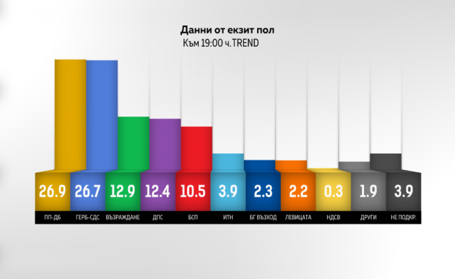 Според изследването на организация „ Тренд ”, поръчано и финансирано от NOVA, резултатът на ПП-ДБ е 26,9% от гласовете, а ГЕРБ-СДС са с 26,7%.