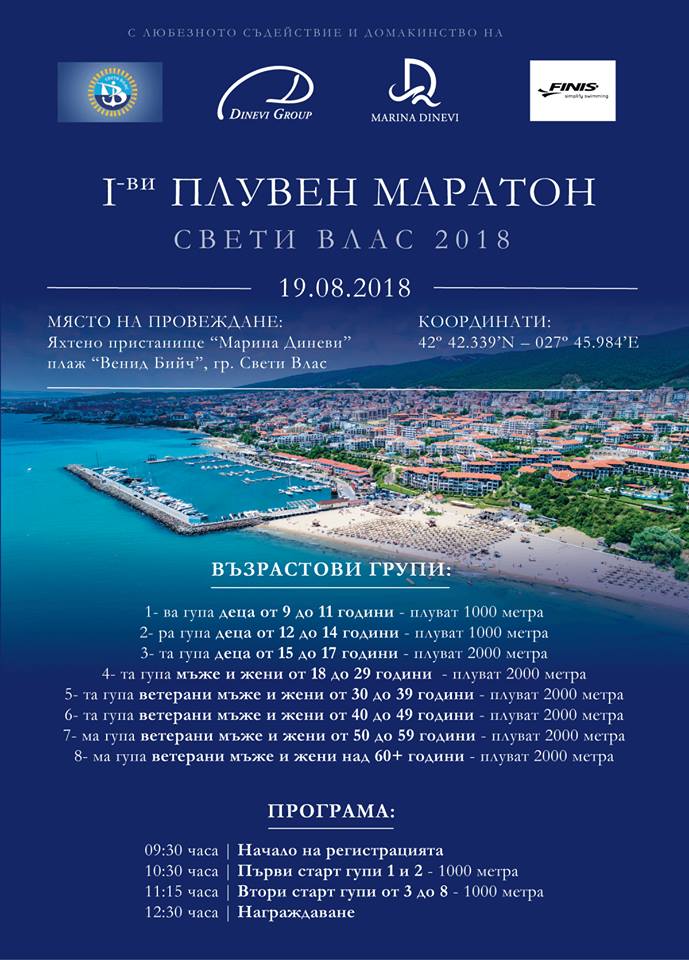 Първият плувен маратон „ Свети Влас “ ще събере в неделя, 19 август, феновете на водните спортове от цяла България. Стартът ще бъде даден в 11:15 часа за участниците в отдалеченост 2000 м и в 10:30 часа за отдалеченост 1000 м на плаж „ Венид бийч “ до Марина Диневи. Организатори на събитието са кметството в Свети Влас, „ Диневи груп “ и „ Финис “ – България, а основатели са трима плувни ветерани, майстори на спорта по скоростно плуване – Петър Георгиев, и Златко и Людмила Белчеви от Свети Влас.
