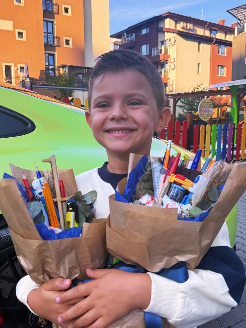 Изкусителката Джулиана Гани също има първолак. Малкият Давид изглеждаше разчувствуван за новия път, по който поема. С необятна усмивка и ексцентрични букети с цветни моливи и други учебни принадлежности той стартира приключението си в учебно заведение.