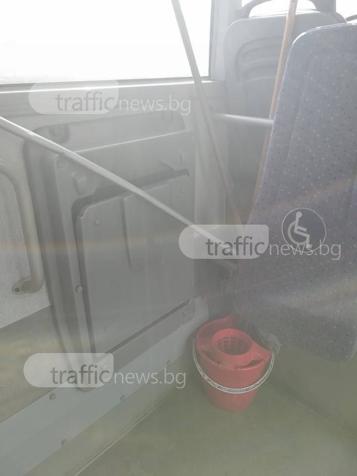 Първото нещо, което виждат пасажерите като се качат в един от пловдивските рейсовете по линия №116 е кофа, парцали и вода на пода. За това ни алармира пловдивчанин, който е имал „ удоволствието” да се визи през вчерашния ден в транспортното средство.