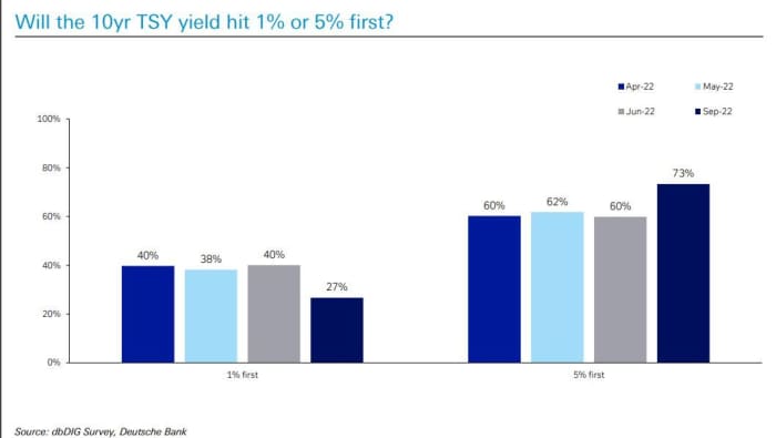 От изследването през юни упованията за 5% рентабилност на 10-годишните държавни облигации на Съединени американски щати са нарастнали до 73% от 60%: