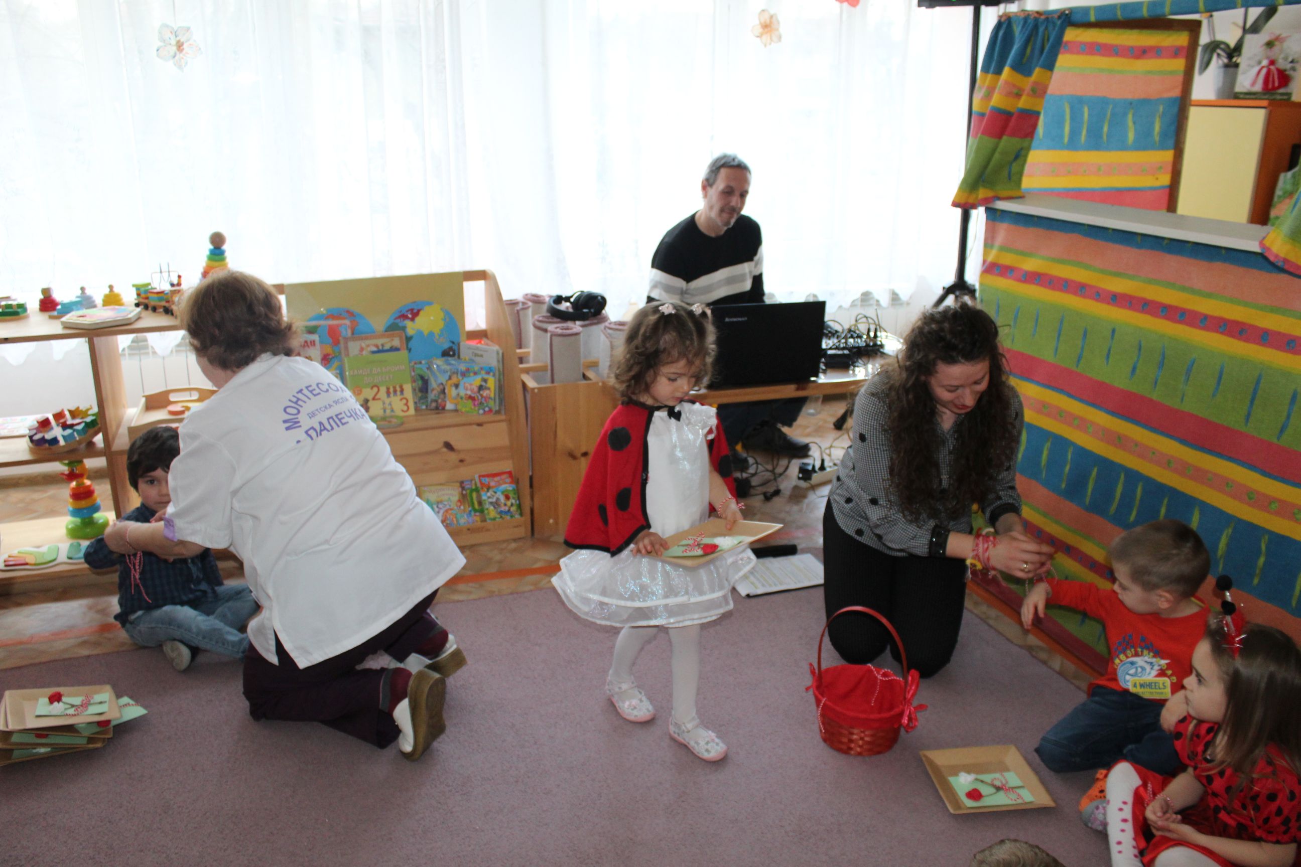 С още един куклен очерк бе обещано началото на Монтесорско занятие. Главни герои в него бяха коте, бяло и алено кълбенце. Кълбетата обясниха на котето, че не са за игра, а от тях децата ще създадат мартенички.Малчуганите седнаха в кръг и започнаха да творят със усърдие и умелост.
