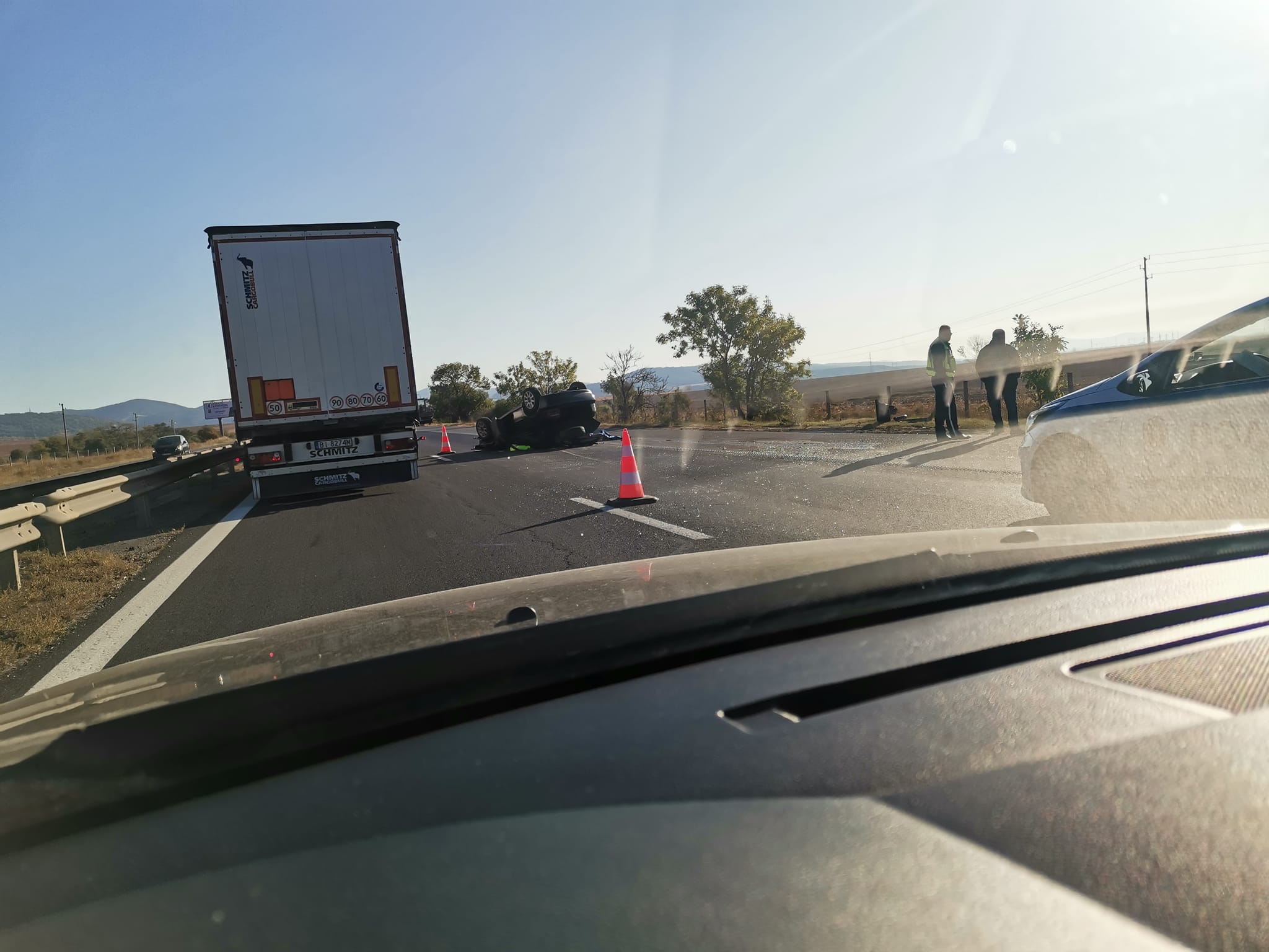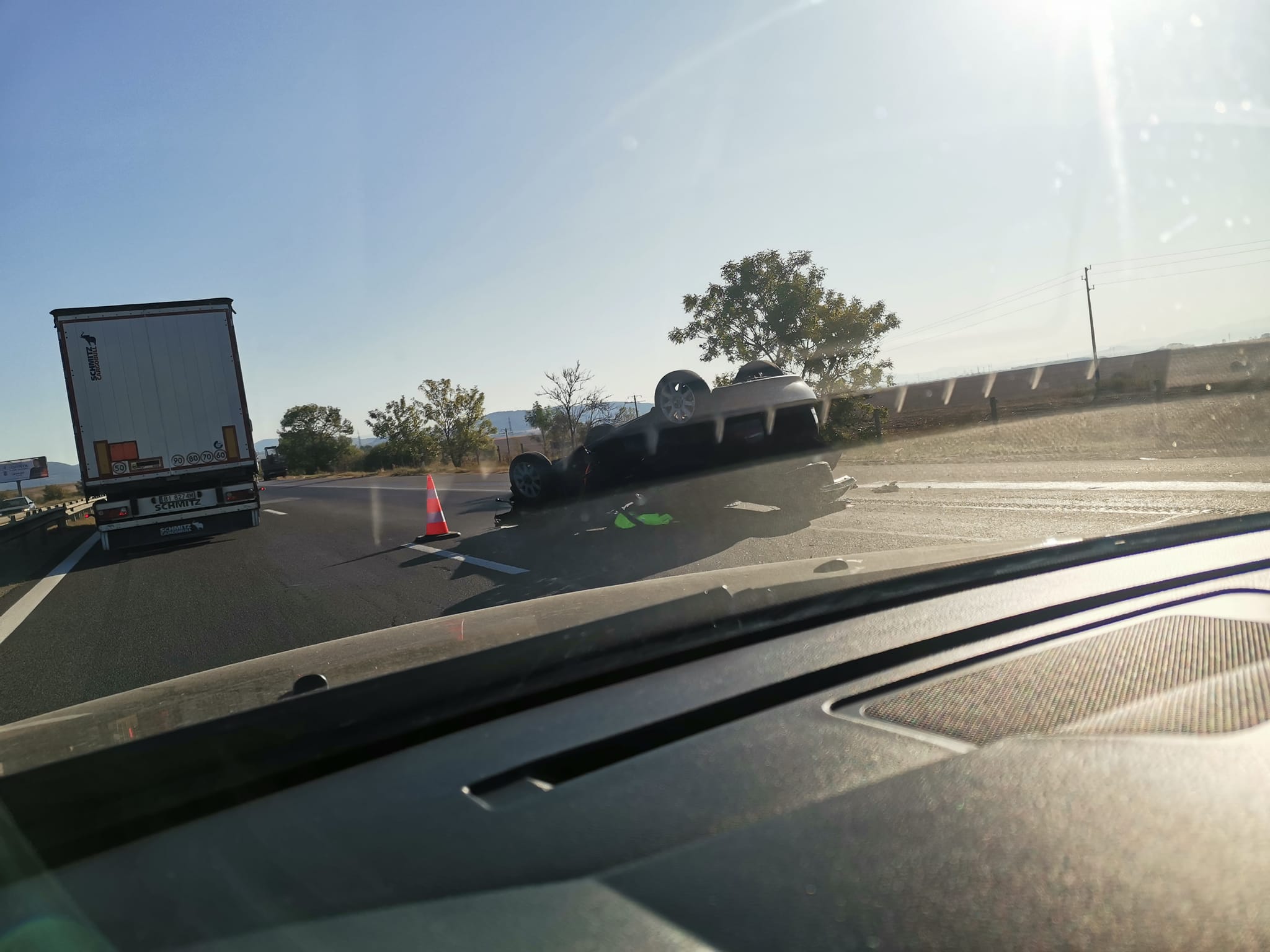 Кола се обърна по таван на АМ Хемус СНИМКИ