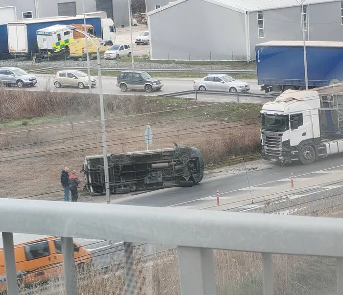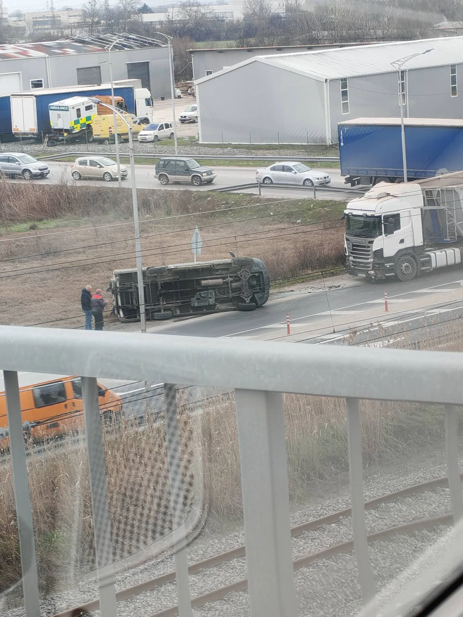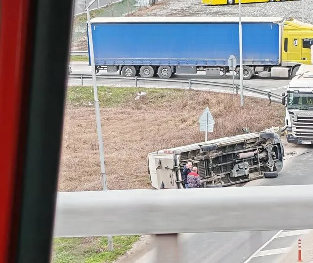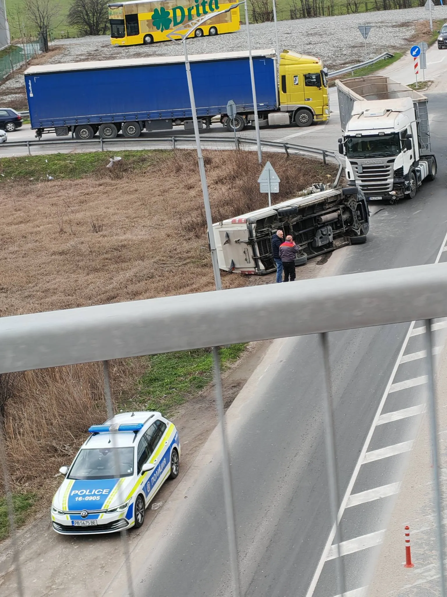 Бус се е обърнал на пътното платно. Прооизшествието е в региона на " Скобелева майка ", на слизане от пътната връзка към Ягодово.