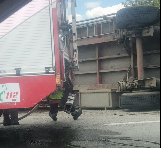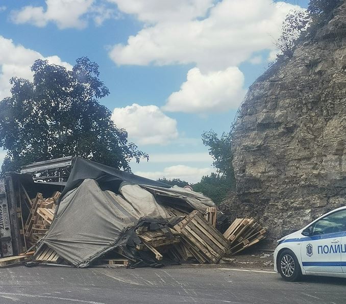 Камион се обърна на оживен път СНИМКИ