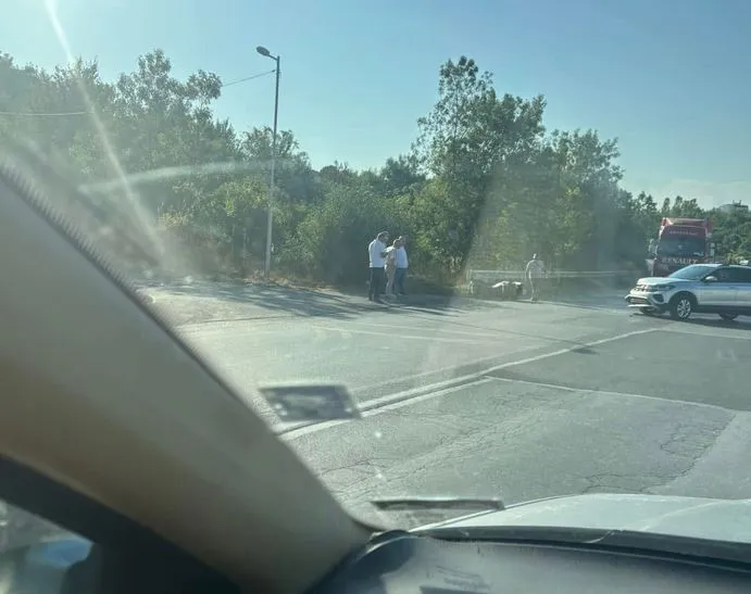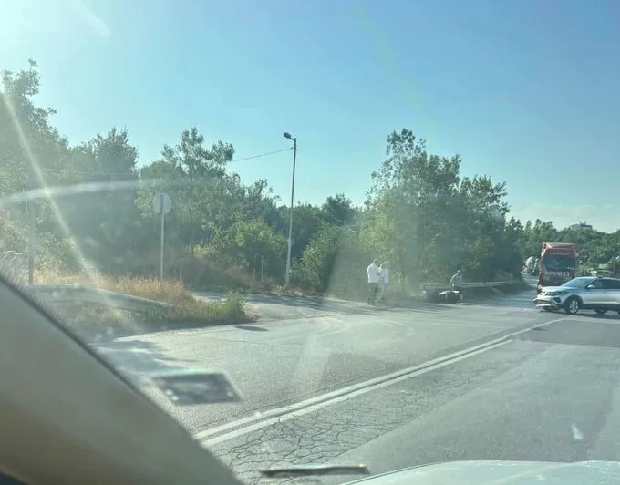 Кола и мотор са се блъснали на " Горнобанския път ". Двуколесното транспортно средство лежи на асфалта, а по автомобила има материални вреди по предницата.