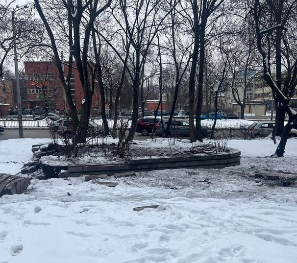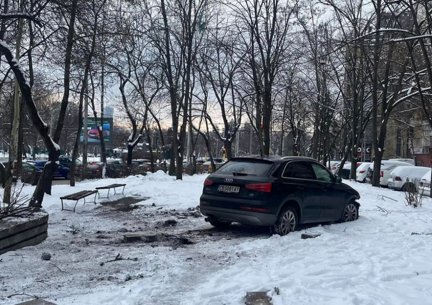 Повалени са колчета и кошчета, по тротоара има счупени елементи. Предната ризница на черното " Ауди " е счупени.