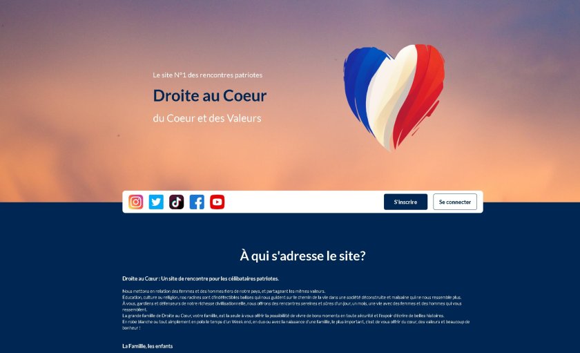 " Патриотизмът в никакъв случай не е бил толкоз сантиментален " - това е мотото на " Десницата в сърцето ", първата във Франция платформа за запознанства на дяснонастроени гласоподаватели, които желаят да срещнат половинката си онлайн и да стартират романс с сходни на тях " патриоти ".