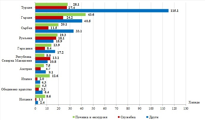 През декември 2022 година максимален брой пътувания на български жители са осъществени към:Турция - 170,6 хиляди, Гърция - 108,3 хиляди, Сърбия - 64,7 хиляди, Румъния - 53,3 хиляди, Германия - 39,5 хиляди, Република Северна Македония - 31,9 хиляди, Австрия - 21,3 хиляди, Италия - 18,9 хиляди, Обединеното кралство - 13,9 хиляди, Испания -12,1 хиляди (фиг. 2).
