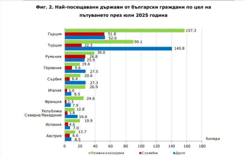 Най-голям брой пътувания на български жители са осъществени към: Гърция - 261.7 хиляди, Турция - 253.2 хиляди, Румъния - 91.7 хиляди, Германия - 56.7 хиляди, Сърбия - 54.3 хиляди, Италия - 38.4 хиляди, Франция - 34.8 хиляди, Република Северна Македония - 33.2 хиляди, Испания - 31.5 хиляди, Австрия - 28.8 хиляди, оповестиха от Национален статистически институт.
