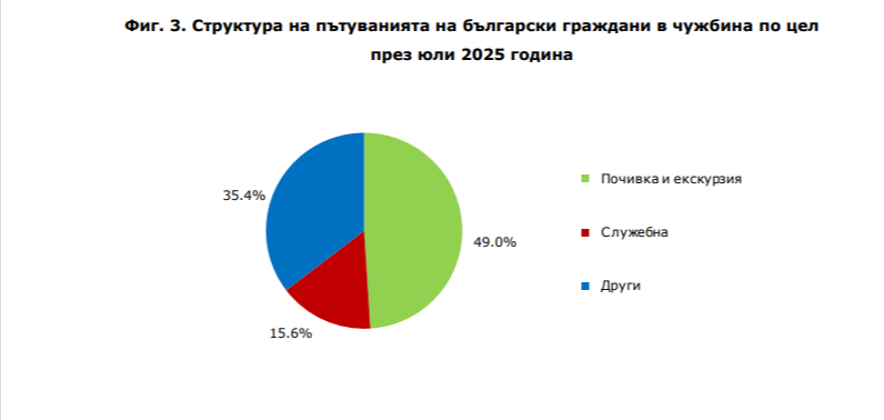 Пътуванията на български жители в чужбина през юли 2025 година са 1 006 300 или с 16.8% повече от юли 2024 година. Регистрирано е нарастване на пътуванията по всички наблюдавани цели.