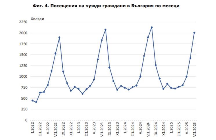 През юли 2025 година визитите на непознати жители в България са два милиона и четири хиляди и седемстотин или с 5.6% повече в съпоставяне със същия месец на миналата година. Регистрирано е нарастване на пътуванията по всички следени цели. Транзитните прекосявания през страната са 36.5% (730.8 хил.) от всички визити на непознати жители в България.