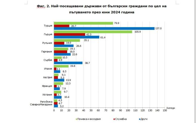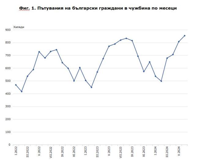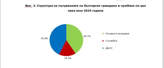 Пътуванията на български жители в чужбина през юни 2024 година са 854.6 хил., или с 8.1% повече от юни 2023 година . Регистрирано е нарастване на пътуванията по всички следени цели: отмора и екскурзия - с 13.3%, други цели (гостуване, образование, посещаване на културни и спортни мероприятия) - с 6.4%, и със служебна цел - с 1.0% (виж фиг. 1).