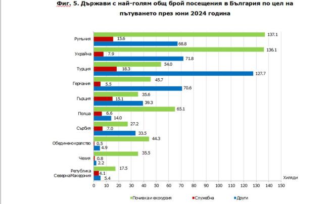 Най-много визити в България са осъществили жителите от: Румъния - 221.5 хиляди, Украйна - 215.8 хиляди, Турция - 200.0 хиляди, Германия - 121.8 хиляди,