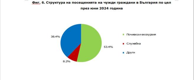 През юни 2024 година визитите на непознати жители в България са 1 472.9 хил. , или с 5.8% повече в съпоставяне със същия месец на миналата година (виж фиг. 4). Регистрирано е нарастване на пътуванията по следните цели: отмора и екскурзия - с 11.2%, с други цели - с 1.0%, до момента в който тези със служебна цел понижават с 3.0%. Транзитните прекосявания през страната са 31.0% (456.8 хил.) от всички визити на непознати жители в България.