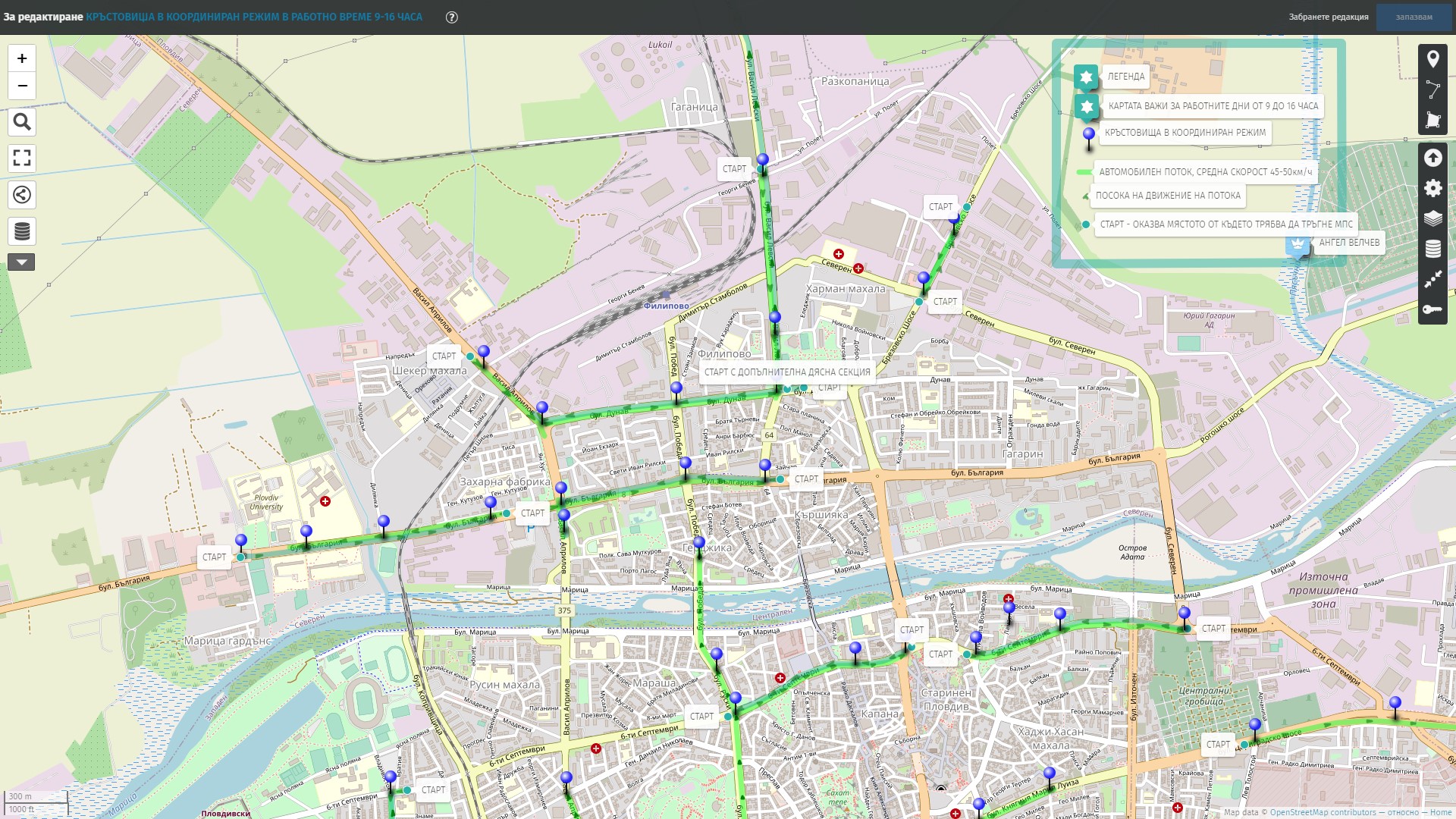 От Центъра за ръководство на трафика направиха интерактивна карта. В нея са онагледени координираните режими на светофарните уредби, като със „ старт “ е показано от кое място би трябвало да се включи моторното транспортно средство. Обхванати са интервалите от 09:00 до 16:00, от 19:00 до 21:00 часа, както и целодневно в събота и неделя, при скорост на колите 45 – 50 километра в час.