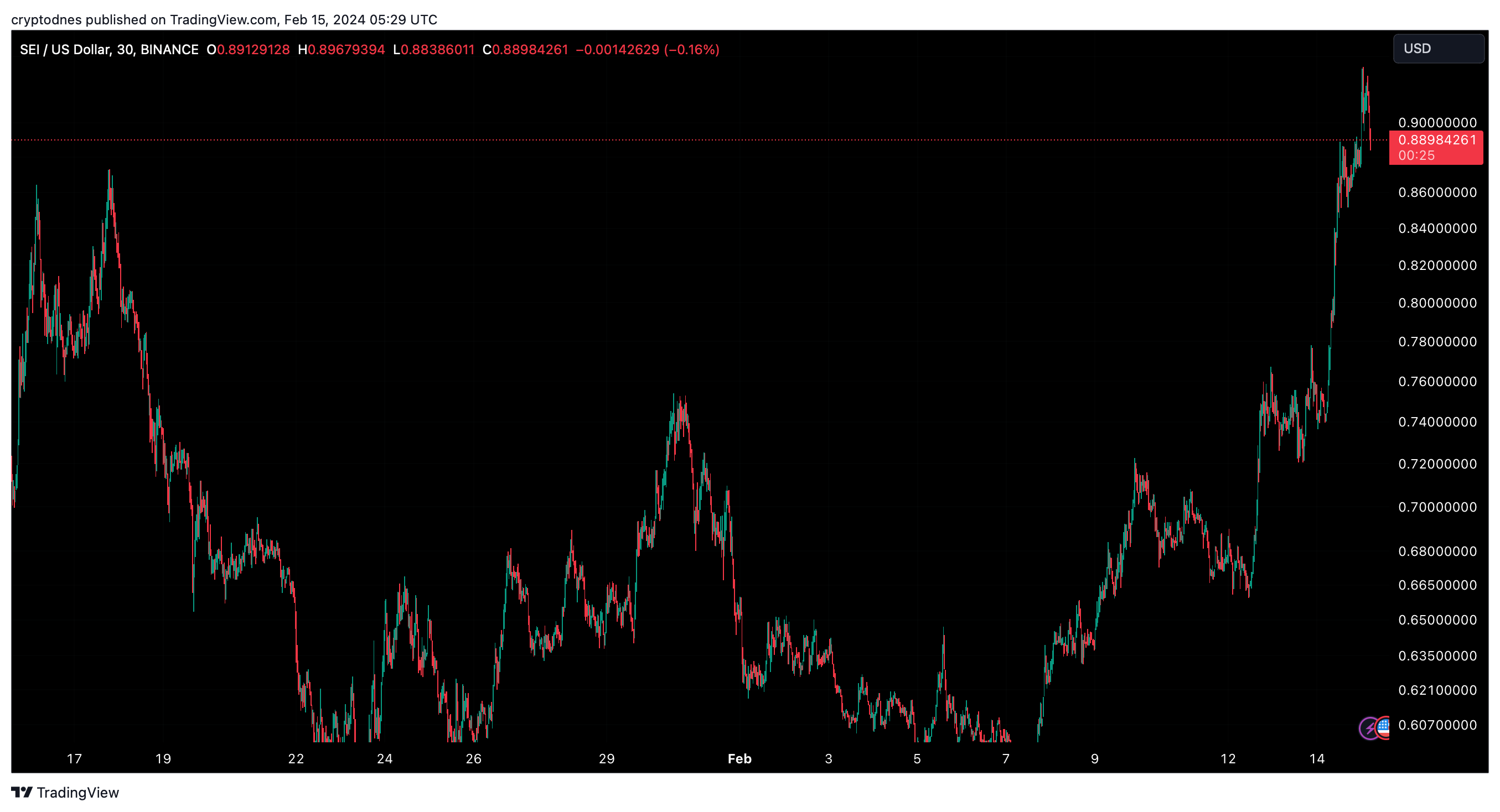 Въпреки това низходящият тренд спря на 23 януари. След по-високо дъно на 7 февруари инерцията на SEI се форсира, което докара до пробив над съпротивата от $0.85 през вчерашния ден, достигайки нов връх от $0.90.