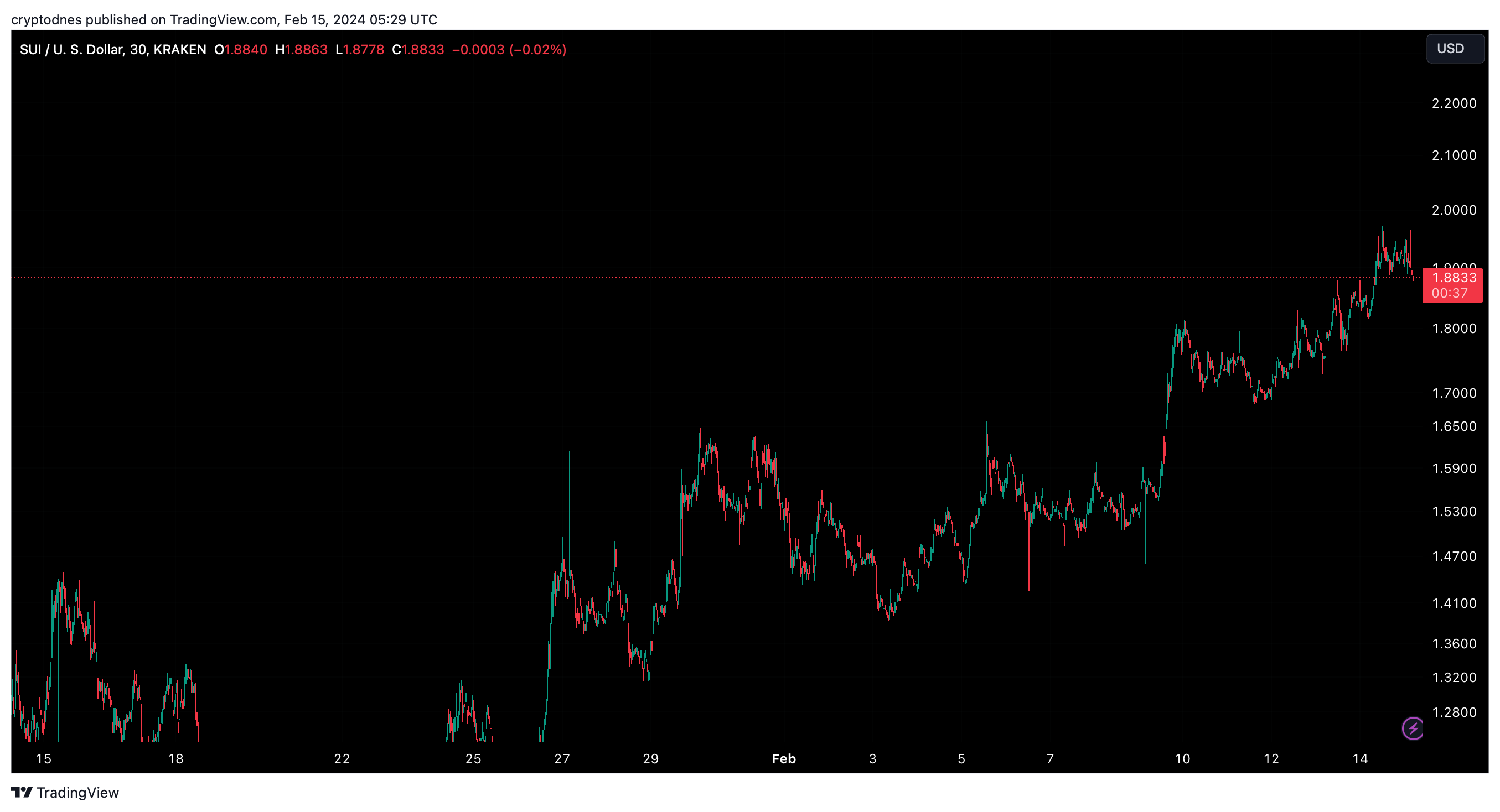 През последния интервал инерцията на SUI единствено се ускорява. Вчера той доближи рекордно висока стойност от $1.97. Освен това показателят на относителната мощ (RSI) демонстрира позитивна инерция.