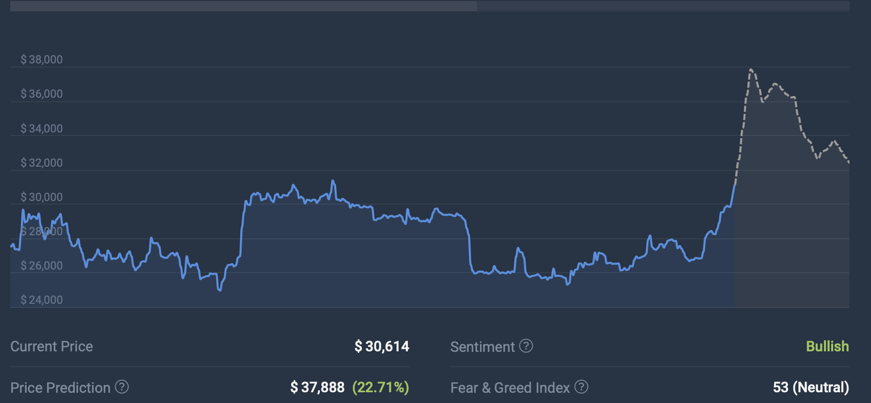 Според актуалната прогноза на CoinCodex за цената на Биткойн, цената на монетата се чака да нарасне с 22.71% и да доближи $37,888 до 28 октомври 2023 година Настоящите механически индикатори демонстрират бичи настроения, а показателят на страха и алчността е на равнище 53, което алармира за неутрални настроения.