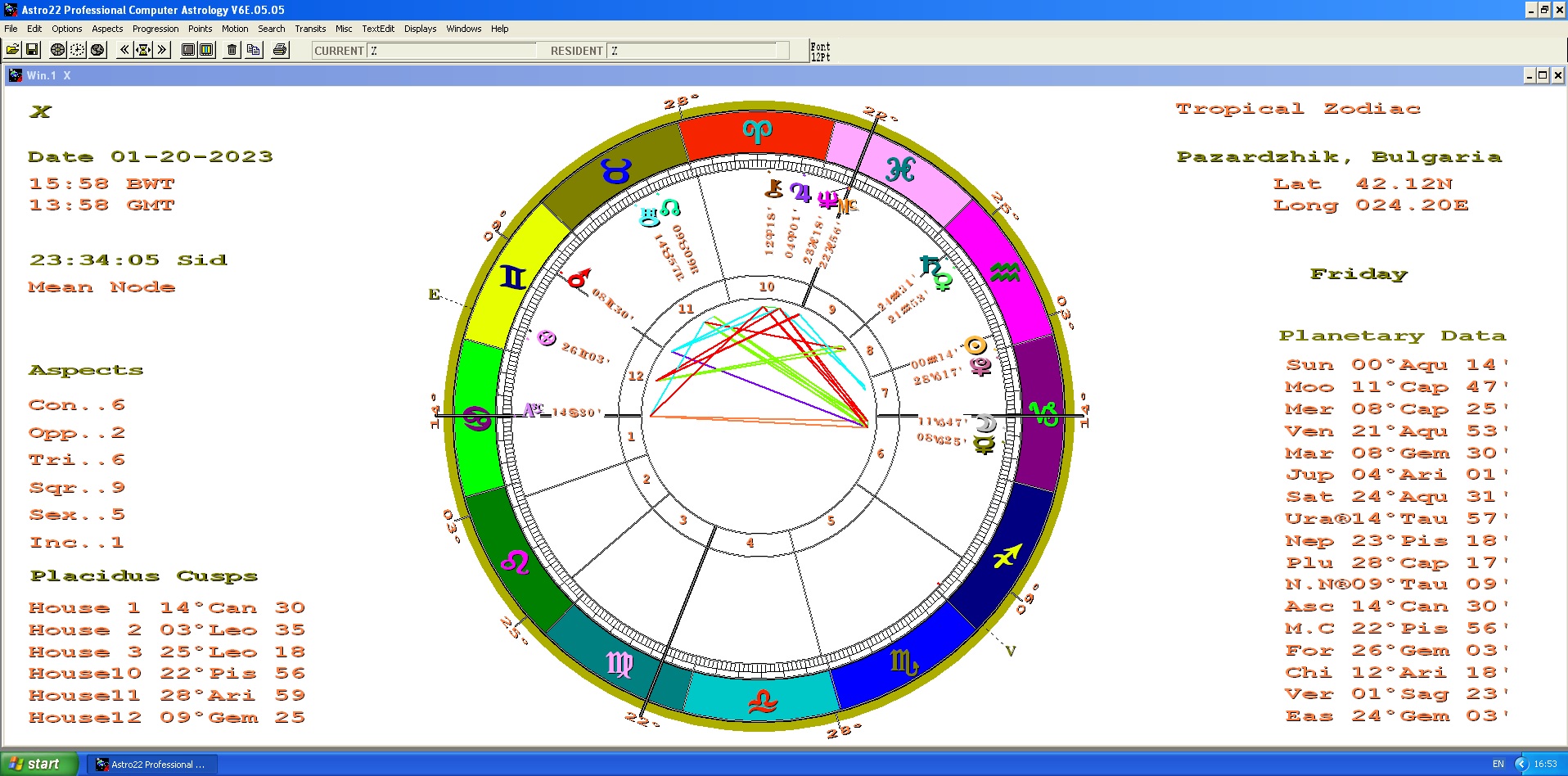Създадена е карта за ден и час на заложеният въпрос. Използва се хорарната астрология. Това е астрологична карта, която няма нищо общо с наталната астрология. Самата карта е разграничена на 12 елементи, които назоваваме домове. Асцендентът, или изгряващият знак, е постоянно питащият, а седми дом за случая съставлява лицето Ружа Игнатова.