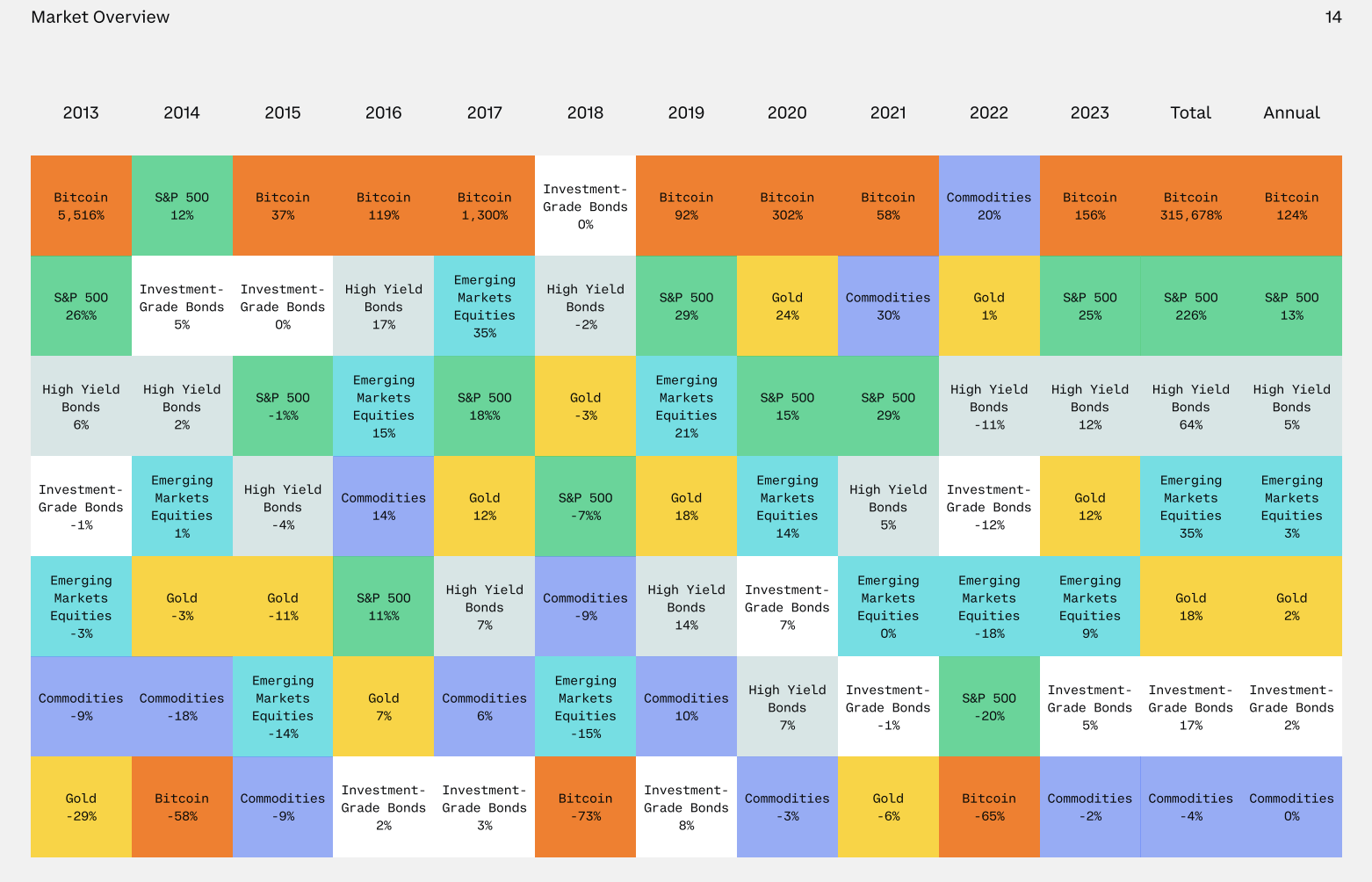 BTC е бил най-добре представящият се актив през 8 от последните 11 години, което демонстрира капацитета му за обилни облаги. От значително значение е обаче да се означи, че през останалите три години той е бил най-слабо представящият се актив, преживявайки съществени спадове.