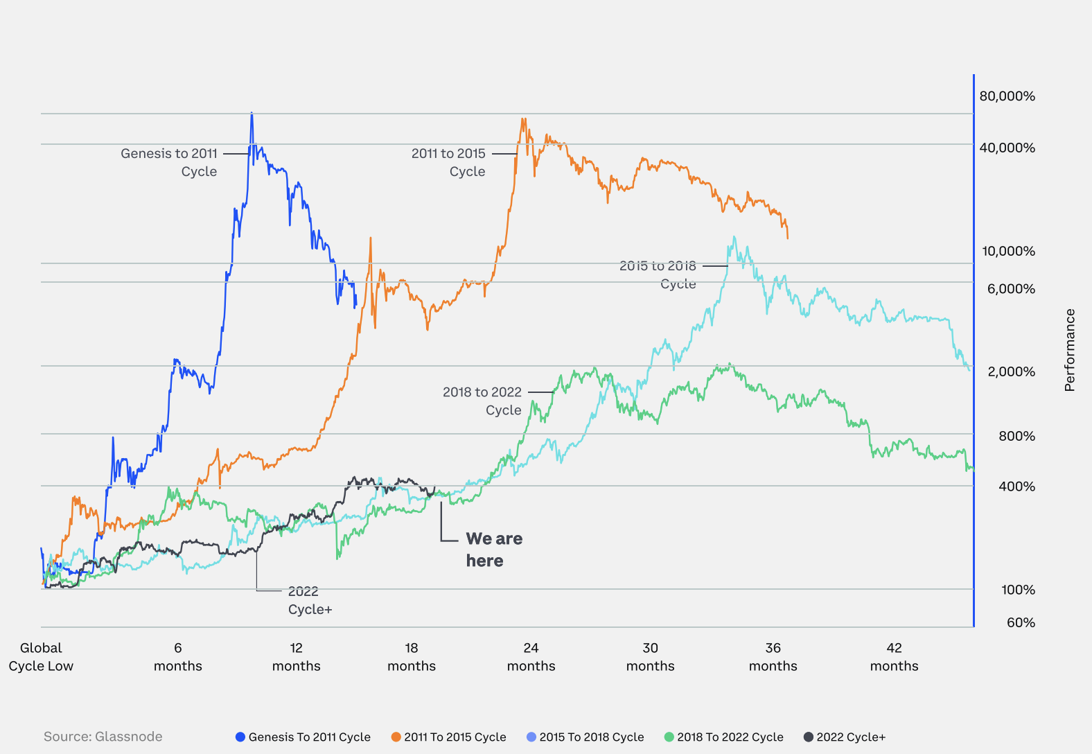 Проучването на четирите пазарни цикъла на Биткойн, всеки от които включва както бичи, по този начин и мечи етапи, демонстрира, че актуалният цикъл (започващ през 2022 г.) е отбелязал 400% растеж от дъното си през ноември 2022 година Това показване припомня на цикъла 2018-2022 година, когато BTC реализира нарастване от 2,000% от дъното на цикъла си. Траекторията на напредък на настоящия цикъл допуска капацитет за по-нататъшно повишаване.
