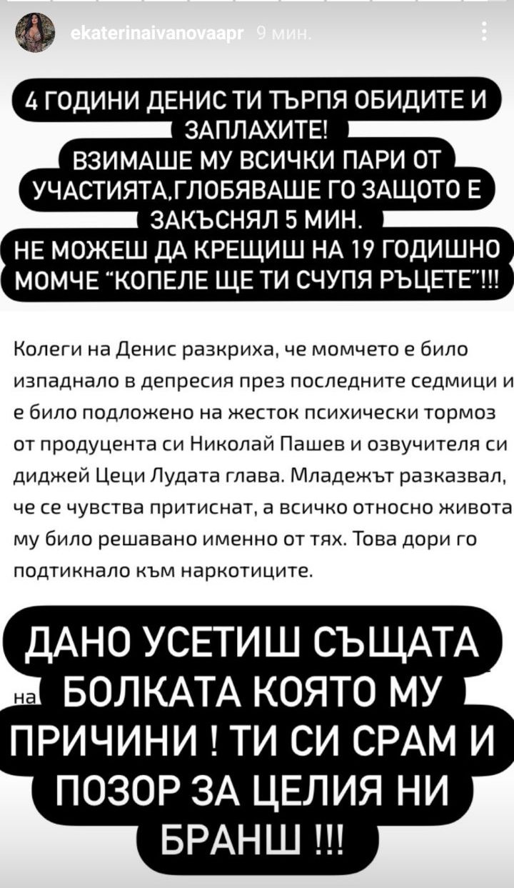 Тези нейни думи са върху медийна обява, в която се споделя, че Денис е бил подложен на душевен тормоз от продуцента си Николай Пашев и озвучителя си диджей Цеци Лудата глава. Кой от двамата засяга Екатерина Иванова не става напълно ясно.