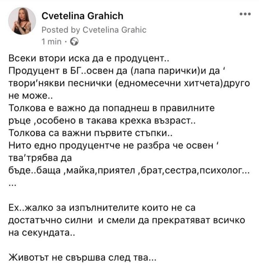 С обява по тематиката излезе и Цветелина Грахич. Както е известо, откакто се раздели с " Ку-ку Бенд ", тя се впусна да гради независима кариера, като за малко е работила с въпросния продуцент. Не след дълго обаче е съумяла да се отдели от него.