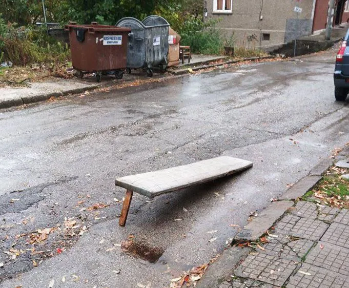 Няколко туби се мъдрят пред входната врата на къща, а до тях стои цяла рота аварийни бутилки. Част от счупена скамейка се е преродила в спонтанен конус, подложен на пътното платно, а старичък стол пази паркомясто паралелно до вдигнати скоби.