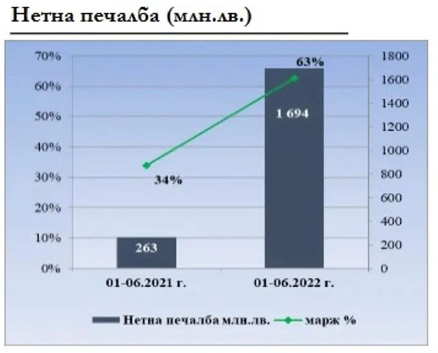 Нетната облага на държавното сдружение за първите шест месеца на 2022 година доближава 1.7 милиарда лева при регистрирана за същия интервал на 2021 година такава от 263 млн. лева