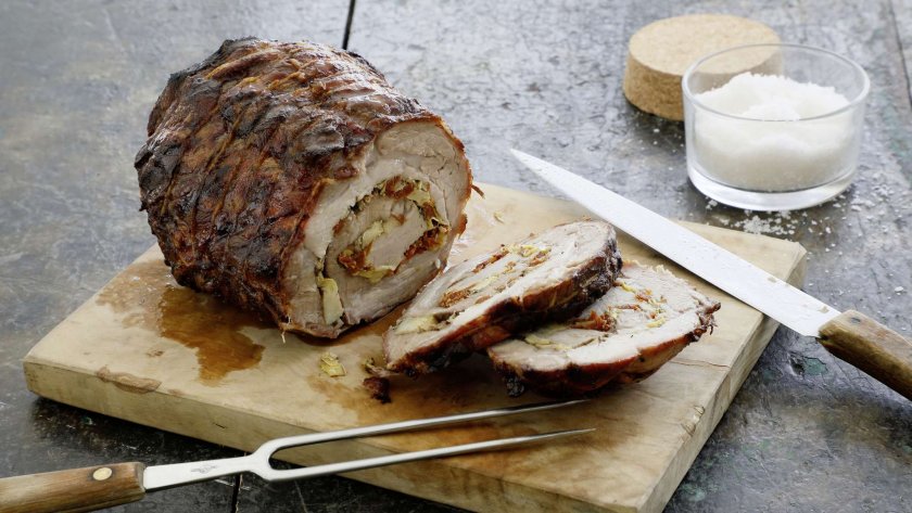 Печеното месо на руло с плънка не е комплицирана, само че е огромна работа когато е готово и поднесено в паница. Получава се всичко в едно: и хрупкава коричка, и сочно месо, и дъхава плънка, а и сосче от печенето. Затова си коства малко да си поиграем с конеца – това е най-трудното, по този начин да се каже, от цялото подготвяне.