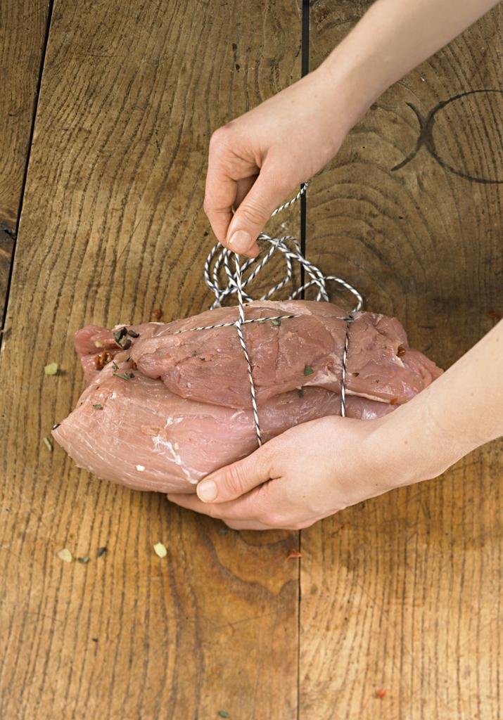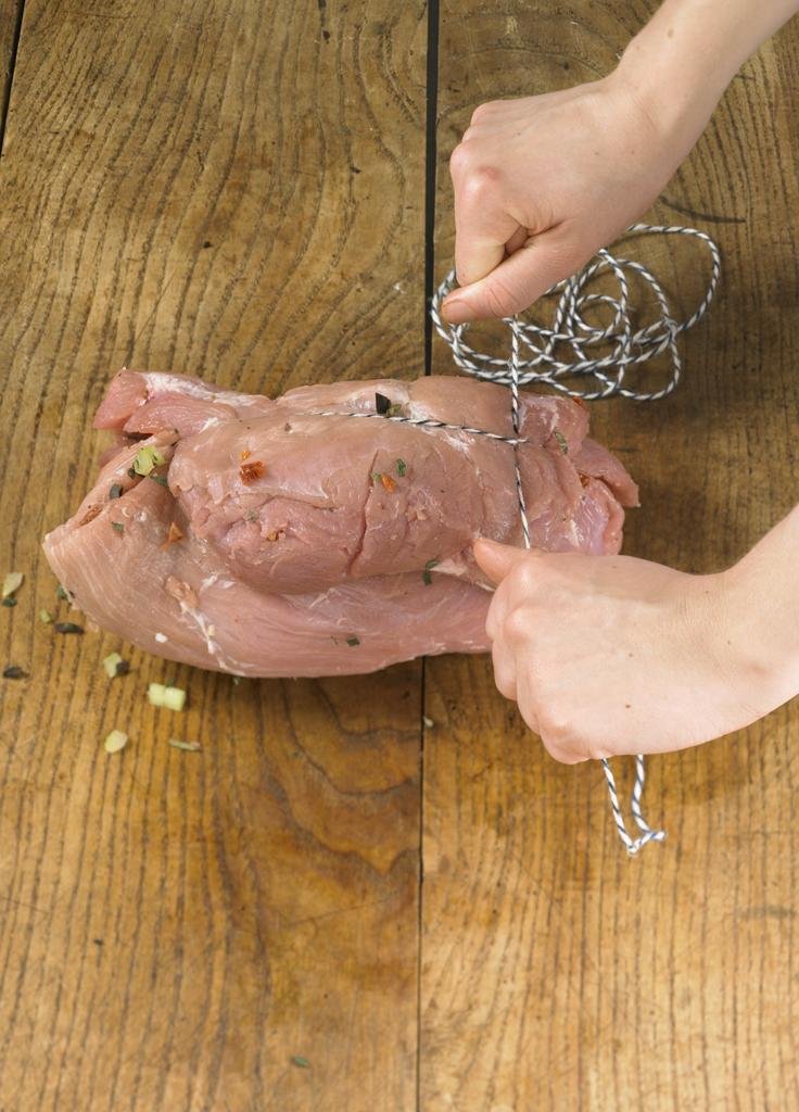 Тъй като месото губи размер – свива се при печене, напречно месото се завързва гъсто на дребни дистанции.