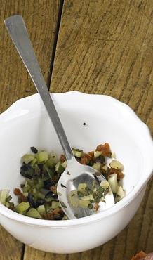 За плънката се смесва нарязаните маслини, сушени домати, целина и листенцата салвия.