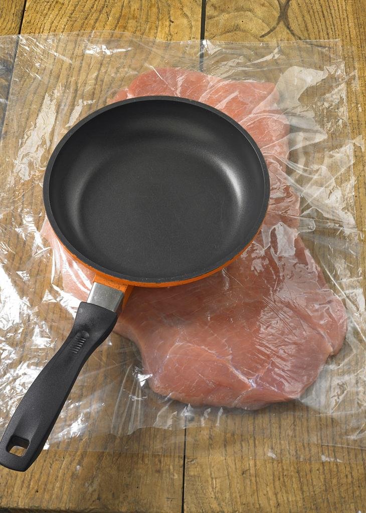 Месото се слага сред два листа транспарантно фолио и се начуква нежно, с цел да се усили площта му. Може да се направи и с по-тежък тиган. В никакъв случай не би трябвало да се нарушава целостта на месото. Натрива се със сол и черен пипер от двете страни.