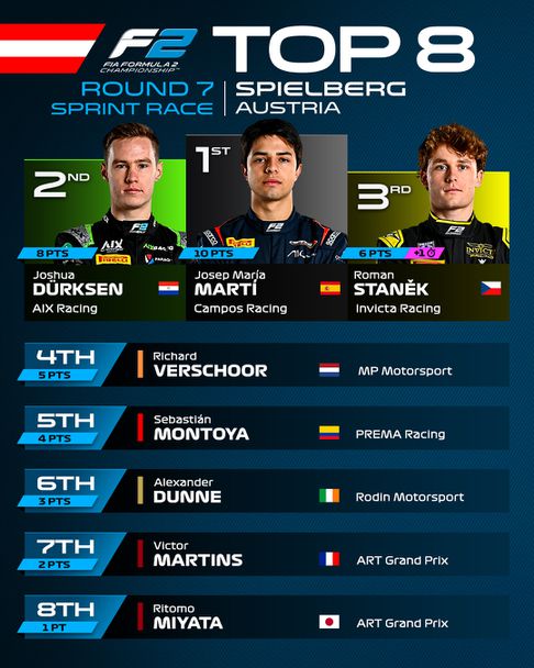 Пепе Марти завоюва своя втори спринт за сезона във Формула 2 след една здрава борба с парагвайския водач Джошуа Дюрксен на пистата „ Ред Бул Ринг “ в Австрия.