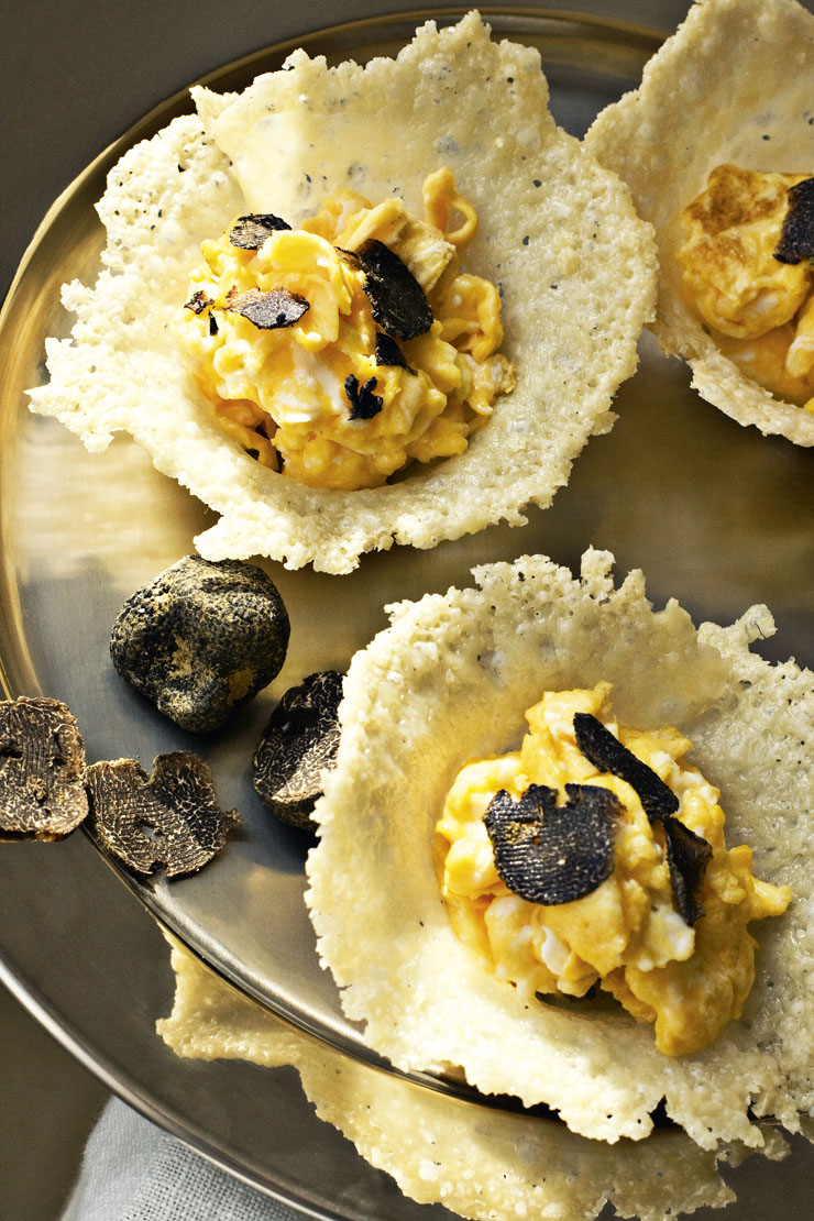 Пармезанови кошнички с бъркани яйца с черен трюфел