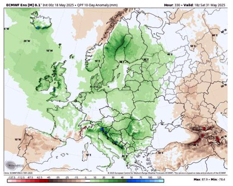 Последната седмица на май се обрисува с превалявания над нормите в доста региони на Европа, демонстрират прогнозите на метеорологичния портал Severe Weather Europe. Значителни количества ще се акумулират на Британските острови и Скандинавските страни, както и по Западните Балкани. У нас дъждовете ще са на повече места и по-напоителни в Северна и в Западна България, предава .