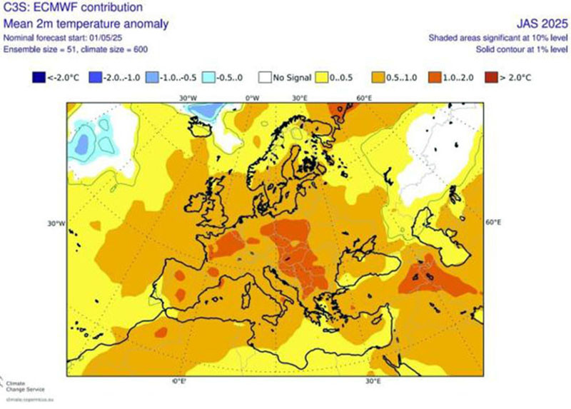 Периодът юли-август-септември за съвсем цяла Европа ще е с по-високи температури от нормалните за сезона. България попада към зоната, където отклоненията от нормите ще са най-значителни. Можем да чакаме тежки летни жеги.