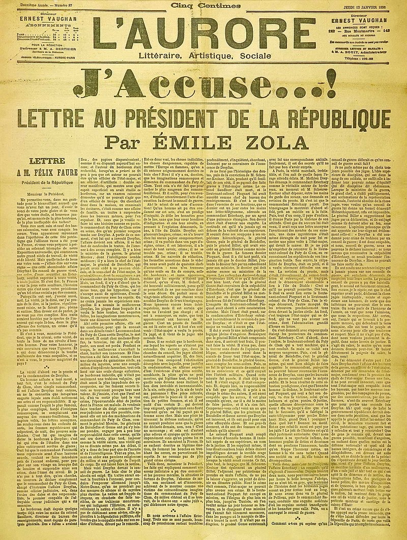 Последвалите журналистически следствия ясно загатват, че действително Драйфус е наказан заради антисемитски аргументи, а не поради ясни и неоспорими обстоятелства. На 13 януари 1898 година, на първа страница на демократичния вестник „ Орор “, е отпечатано най-известното отворено писмо в историята със заглавие – „ Аз упреквам! “. Материалът се трансформира в един от знаците на свободата на словото. По това време създателят му към този момент се е отдръпнал от политическата журналистика, само че сериозността на делото, го кара да се завърне.