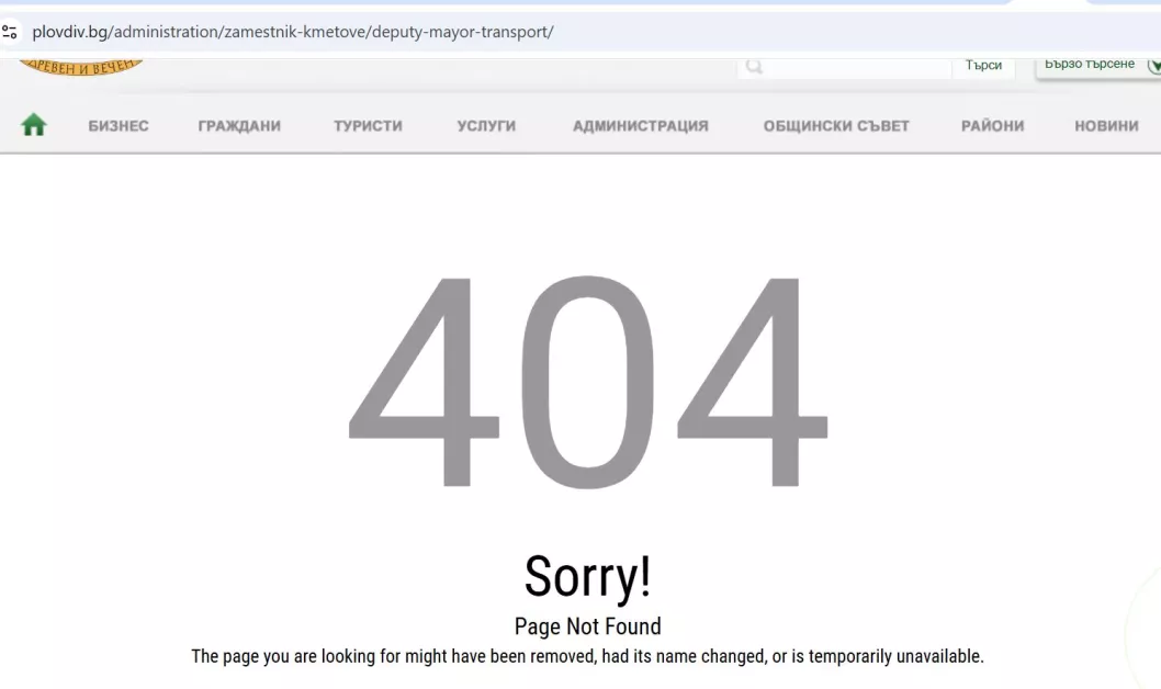 „ 404 - Sorry! Page Not Found “ – това излиза, когато някой реши да ревизира кой дава отговор за превоза в Пловдив и вероятно да потърси контакт. Всъщност, откогато е встъпил в служба неговите дейности дават отговор напълно на изписаното в уеб страницата на Община Пловдив.