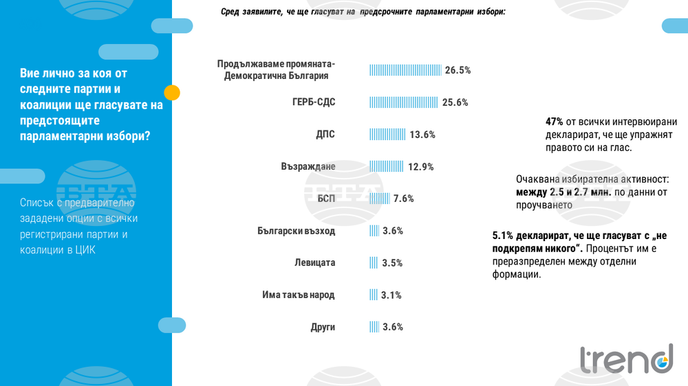 Тренд: Пет партии в следващото НС - победителят е неясен. Янев и Левицата на прага на 4%