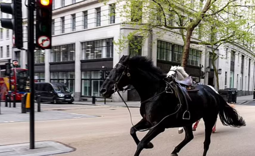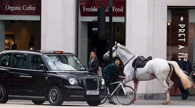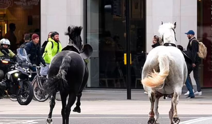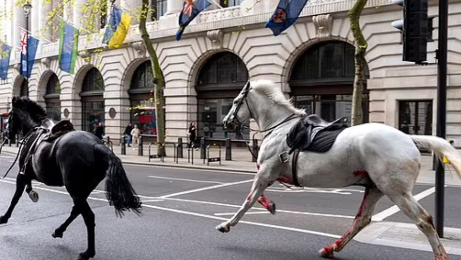 Пет кавалерийски коня, в това число един, целият в кръв, се вилняха в централен Лондон. Животните хвърлили ездачите си по време на утринното упражнение.