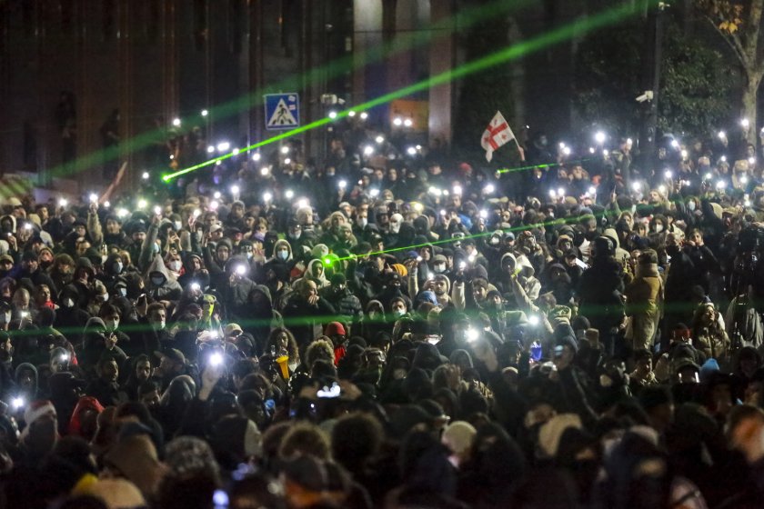 Пета поредна тежка нощ на митинги и арести в Грузия. Залогът е ориентацията на страната, след решението на ръководещата партия " Грузинска фантазия " да замрази договарянията за присъединение към Европейски Съюз до 2028 година Хиляди хора се събраха в сърцето на столицата Тбилиси и други градове, с цел да изразят недоволството си. Над 220 са задържаните протестиращи, десетки са ранените. Наблюдатели оповестяват за шокиращи прояви на полицейско принуждение към стачкуващите, потърпевши са и представители на медиите. Сред тях е и екипът на Българска национална телевизия - журналистът Николай Кръстев и оператора Огнян Колчаков , които бяха обгазени.