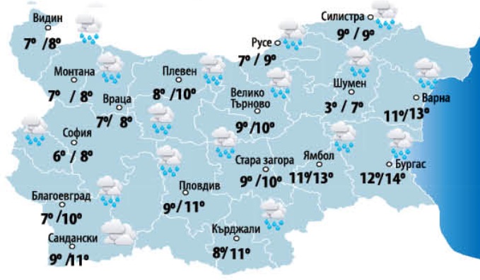 На 25, четвъртък преваляванията краткотрайно ще стопират. После бързо ще се заоблачава, с превалявания по-интензивни в западните и в южните региони.