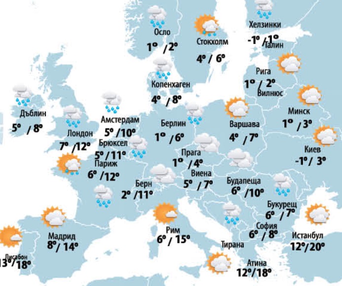Плътни Облачни системи, с океански генезис, ще обгръщат Западна Европа и доближават до Западното Средиземноморие. Дъждове с пороен темперамент, съпроводени от мощни ветрове, ще валят Португалия, Южна Испания и над островите Корсика и Сицилия. Топли въздушни маси са заели Балканите и утринните мъглите в балканските страни ще бъдат постоянно събитие.