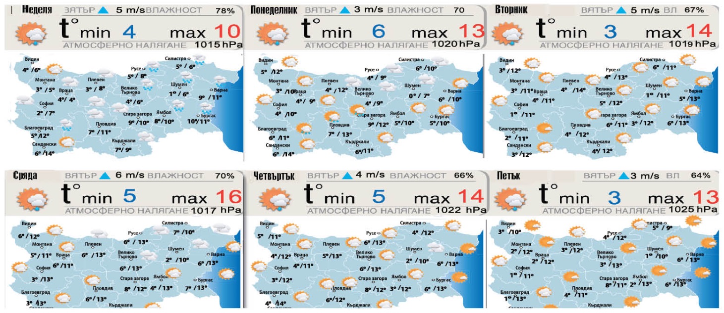 През деня над страната ще има облаци от високия етаж. Следобед и през нощта, против неделя, облачността над южните и над източните региони ще се усилва и уплътнява. В планините ще бъде най-вече слънчево с висока облачност.Максимални температури от 8 до 13 градуса, по Черноморието дневните температури ще доближават до 10, 12 градуса, за региона на София 10, 11 градуса.